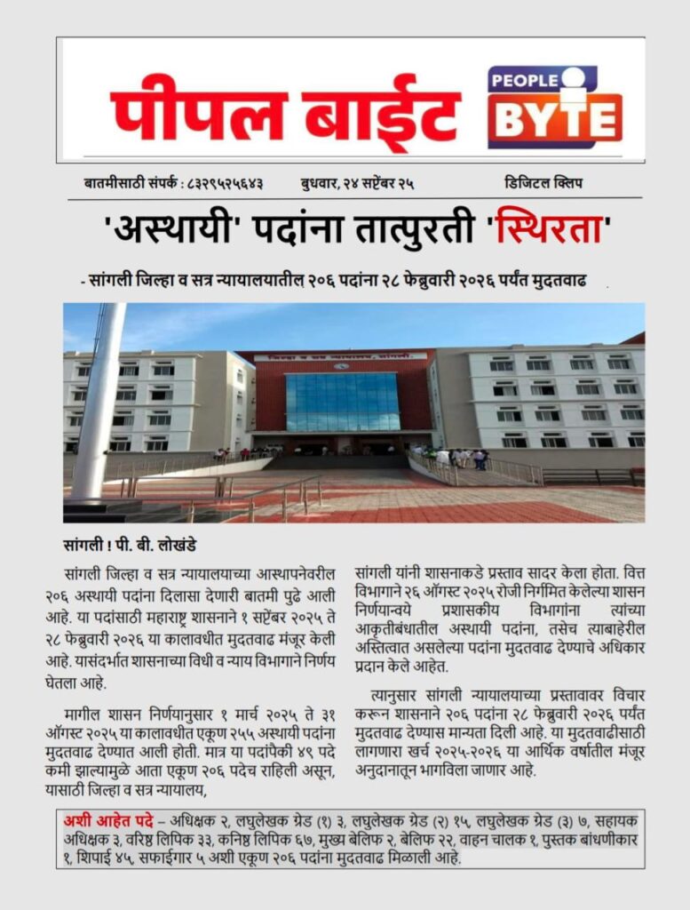 – सांगली जिल्हा व सत्र न्यायालयातील २०६ पदांना २८ फेब्रुवारी २०२६ पर्यंत मुदतवाढ